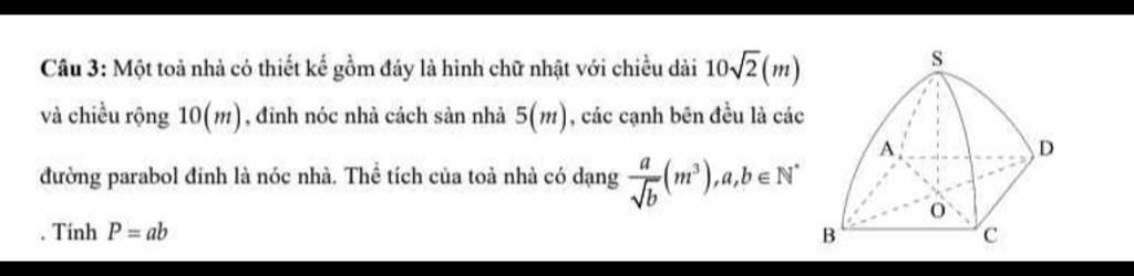 `->` `(P)` có phương trình `z=5-1/10 (x-5sqrt2)^2`