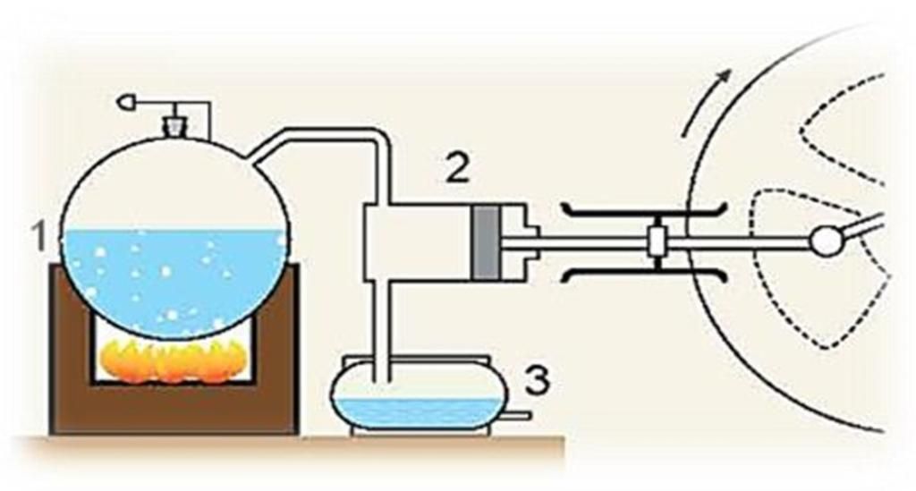 Động cơ hơi nước gồm ba bộ phận chính như hình vẽ: nồi súp de `(1)`, hệ thống xi-lanh và pit-tông `(2)` và bình ngưng hơi `(3)`. Nồi súp de `(1)` có tác dụng