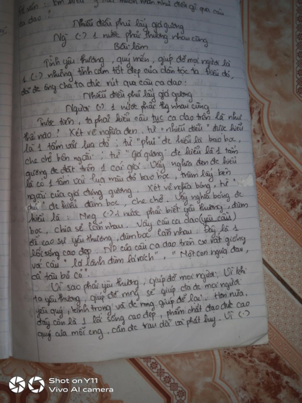 Tóm lại, câu ca dao trên là một lời khuyên chân tình, muốn nhắn nhủ mọi người cùng chung một nước cần phải biết yêu thương, đùm bọc, che chở cho nhau. Đã bao năm trôi qua nhưng câu ca dao vẫn còn giữ ngyên ý nghĩa sâu sắc của nó. Bản thân em luôn ghi nhớ về bài học này, luôn biết sống yêu thương, sẵn sàng giúp đỡ bạn bè hoặc những người có hoàn cảnh khó khăn. Đó là một tình cảm đẹp trong xã hội ngày nay như nhà thơ Tố Hữu đã viết:
