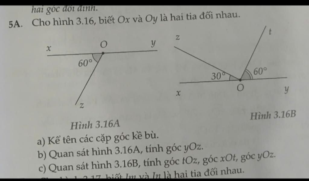 - Ở hình `3.16B:` `\hat{xOz}` kề bù với `\hat{zOy};\hat{yOt}` kề bù với `\hat{tOx}`