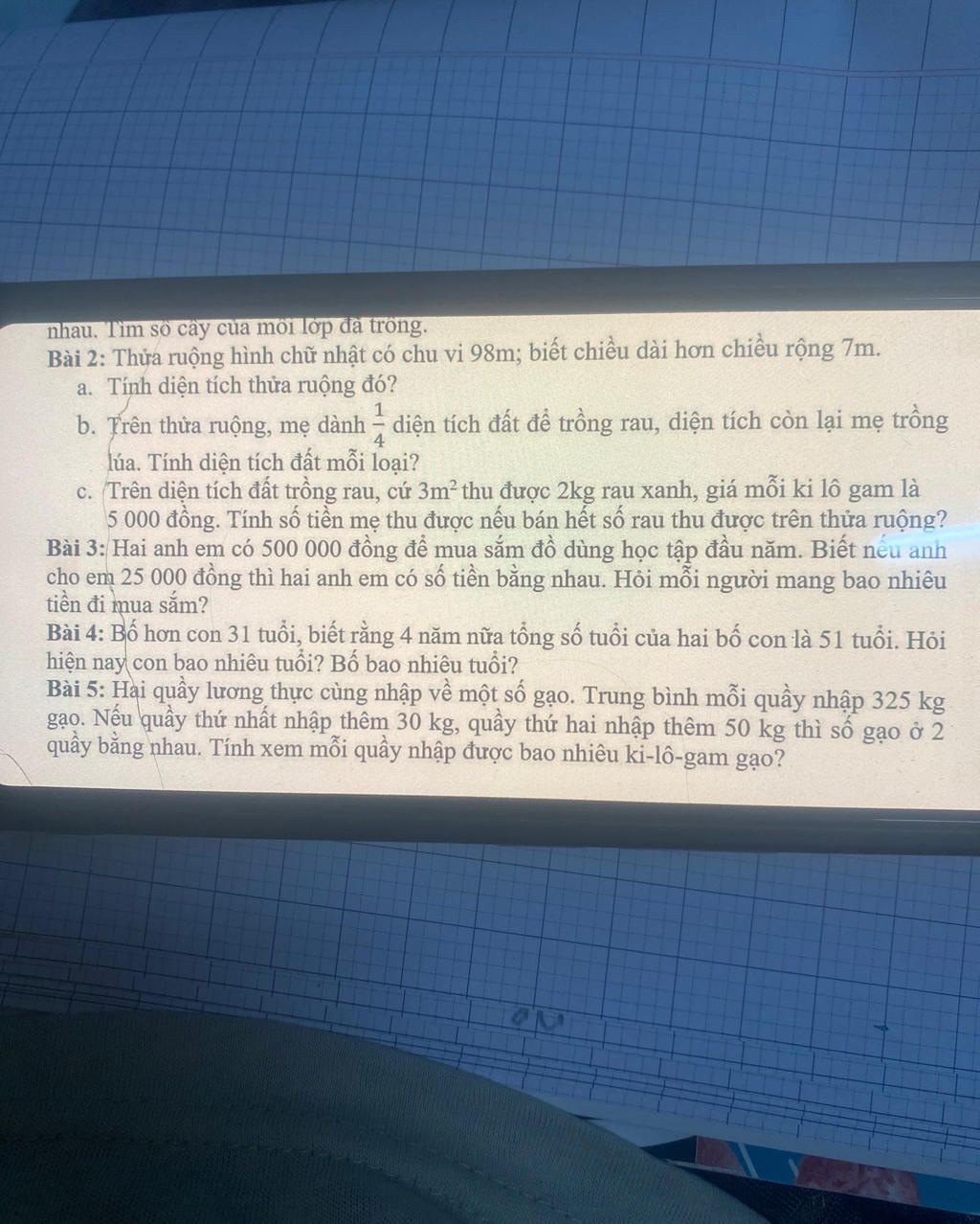 Đáp số: a. 588 m2m2 b. Rau: 147 m2m2; Lúa: 441 m2m2 c. 490 000 đồng