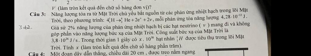 Một phản ứng nhiệt hạch góp phần vào công suất tỏa nhiệt của mặt trời `4,28*10^(-12)*(100%-2%)=4,1944*10^(-12) \ J`