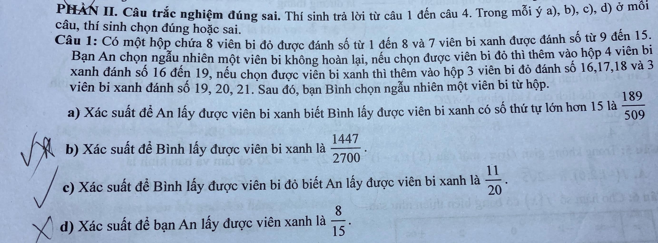 Nếu An lấy ra được bi đỏ thì sau đó trong hộp sẽ có 7 bi đỏ, 7 bi xanh có số $\leq$ 15 và 4 bi xanh có số $\gt$ 15. Sau đó Bình lấy ngẫu nhiên một viên.
