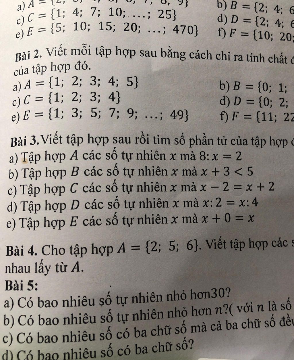 `a)` Tập hợp `A` các số tự nhiên `x` mà `8 : x = 2`