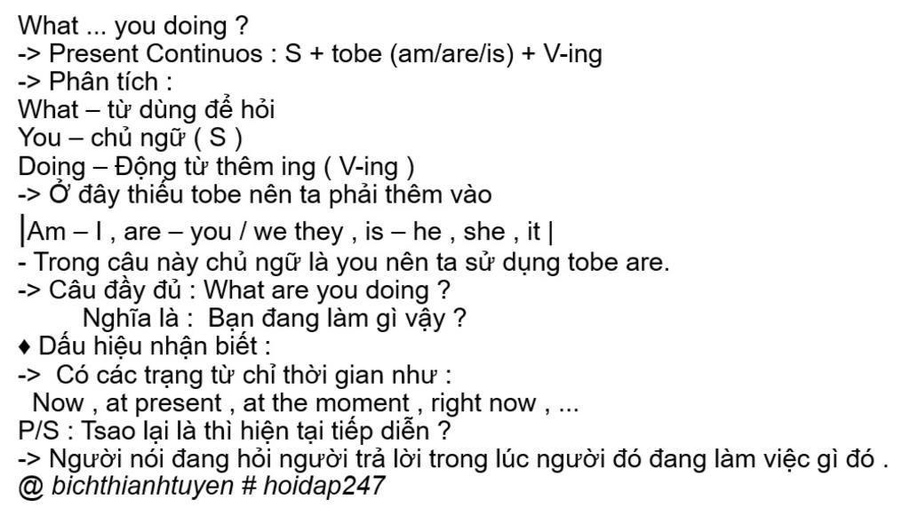 -> Present Continuos : S + tobe (am/are/is) + V-ing