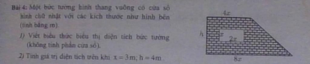 `@` diện tích phần tường ( trừ cửa sổ ) là: `2xh+4xh-2x^2` `(m^2)`