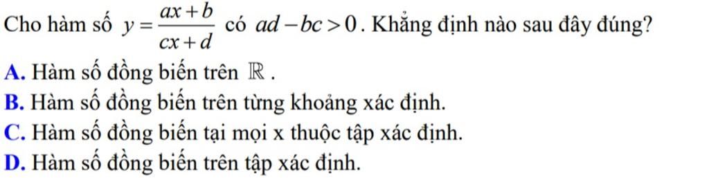 Vì \( (cx + d)^2 > 0 \) với mọi \( x \in D \) và \( ad - bc > 0 \), suy ra \( y' > 0 \) với mọi \( x \in D \).