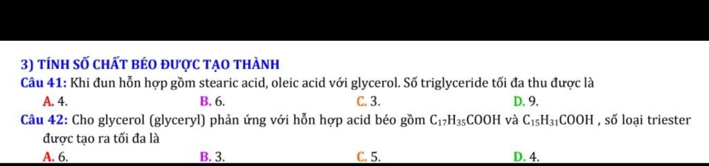 Khi đun hỗn hợp gồm các $acid$ béo với $glycerol$ thì số $triglyceride$ tối đa thu được là: