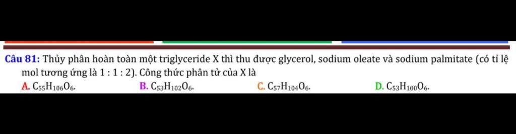 `=>` Công thức phân tử :$\rm cC_{53}H_{100}O_6$