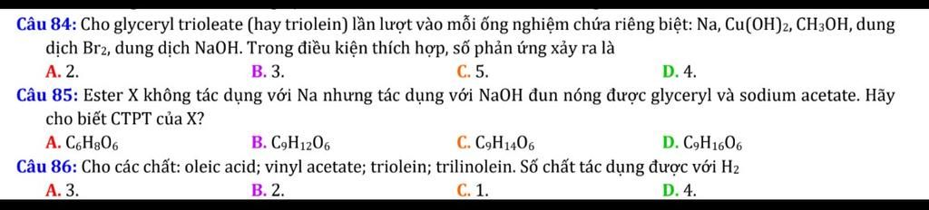 Câu 86: D. 4 tất cả đều chứa liên kết `piC-C` trong phân tử