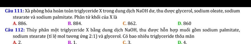 Xà phòng hóa hoàn toàn $triglyceride$ `X` trong dung dịch `NaOH` $dư,$ thu được $glycerol,$ $sodium$ $oleate,$ $sodium$ $stearate$ và $sodium$ $palmitate$