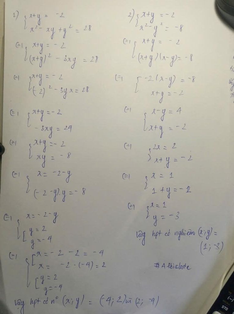 1. $\left \{ {{x + y = -2} \atop {x^{2} - xy+y^{2}=28 }} \right.$\