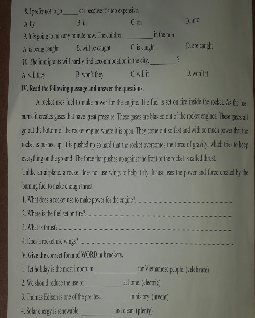 `-` Dẫn chứng : A rocket uses fuel to make power for the engine.