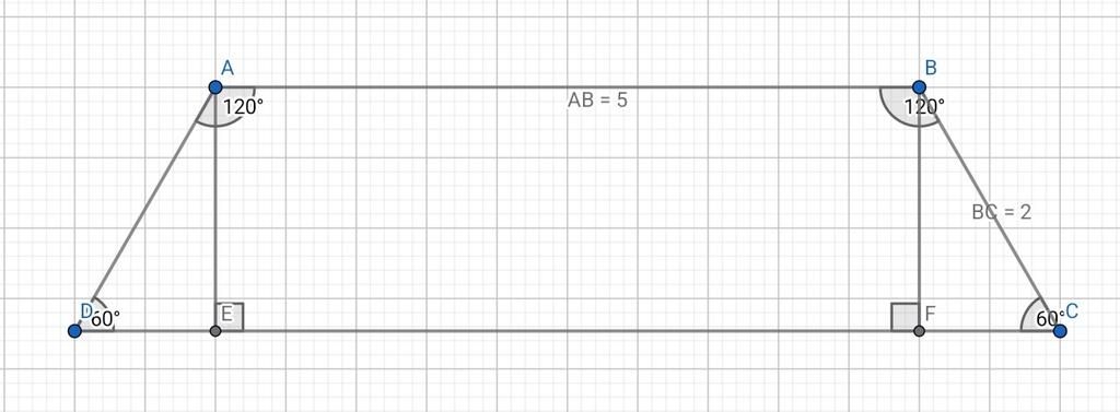 Bài 9: Cho hình thang cân ABCD có đây nhỏ AB - 5cm, cạnh bên BC = 2cm góc tạo bởi cạnh bên và đây nhỏ bằng 120°. Tính độ dài CD