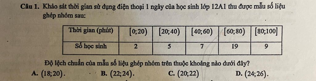 độ lệch chuẩn của mẫu số liệu ghép nhóm trên thuộc khoảng nào dưới đây