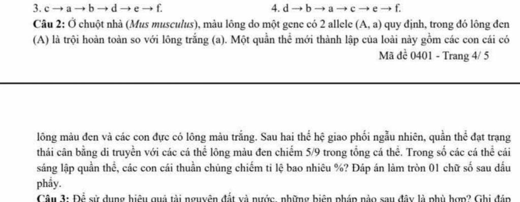 Câu 2: Ở chuột nhà (Mus musculus), màu lông do một gene có 2 allele (A, a) quy định, trong đó lông đen
