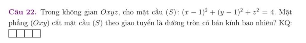 Gọir là bán kính đường tròn giao tuyến của `(S)` và `(Oxy)`,theo định lí Pythagore: