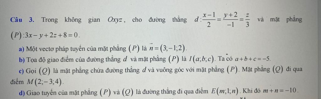b) Tọa độ giao điểm của đường thẳng d và mặt phẳng (P) là I(a,b,c). Ta có a+b+c=-5.