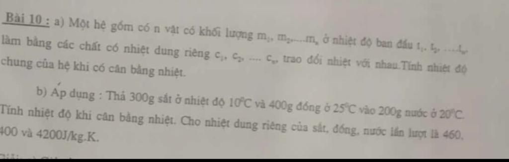 Đề: Một hệ gồm các vật có khối lượng m1,m2,...,mnm_1, m_2, ..., m_nm1,m2,...,mn, nhiệt độ ban đầu t1,t2,...,tnt_1, t_2, ..., t_nt1,t2,...,tn, có nhiệt dung riêng tương ứng là c1,c2,...,cnc_1, c_2, ..., c_nc1,c2,...,cn, trao đổi nhiệt với nhau. Hỏi nhiệt độ chung khi có cân bằng nhiệt là bao nhiêu?