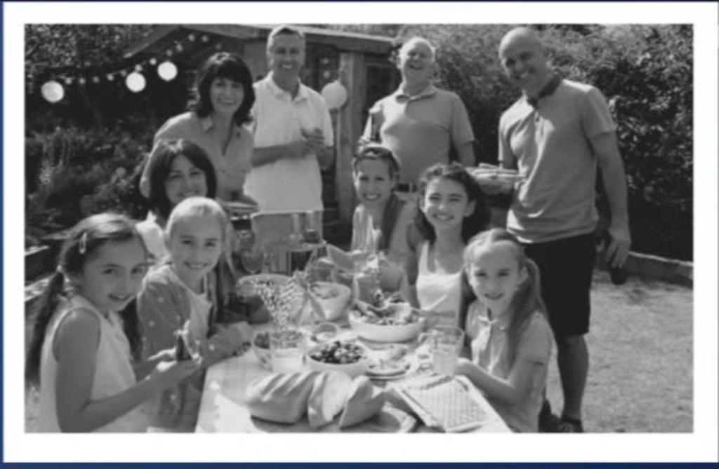 `=>` Trong bức ảnh này, tôi có thể thấy một gia đình lớn có một bữa ăn cùng nhau trong khu vườn của họ. Ở phía trước của bàn, có bốn cô gái trẻ có thể là anh em họ hoặc chị em. Họ đang mỉm cười và dường như đang thưởng thức đồ uống và thức ăn của họ. Cô gái bên trái có thể là con gái út, và những người khác có thể là anh em họ của cô. Đằng sau họ, tôi thấy một số người lớn. Người phụ nữ ở trung tâm có thể là mẹ của họ, và người đàn ông đứng cạnh cô có thể là cha của họ. Có một cặp vợ chồng khác đứng đằng sau họ, có thể là một người dì và chú. Người đàn ông lớn tuổi ở phía sau có thể là ông của họ, và người phụ nữ bên cạnh anh ta có thể là bà của họ. Điều này trông giống như một cuộc tụ tập gia đình hoặc một món nướng. Họ đều hạnh phúc và thoải mái, dành thời gian chất lượng bên nhau. Bàn chứa đầy thức ăn, đồ uống và đồ trang trí, cho thấy họ đã chuẩn bị rất nhiều cho sự kiện này. Đó có thể là sinh nhật của ai đó hoặc chỉ là một cuộc hội ngộ gia đình.