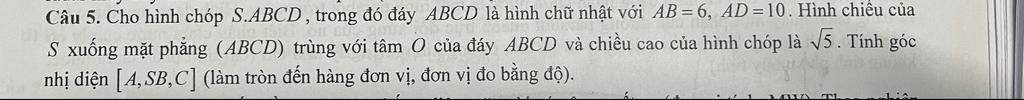 Câu 5. Cho hình chóp S.ABCD, trong đó đáy ABCD là hình chữ nhật với AB=6, AD =10. Hình chiếu của