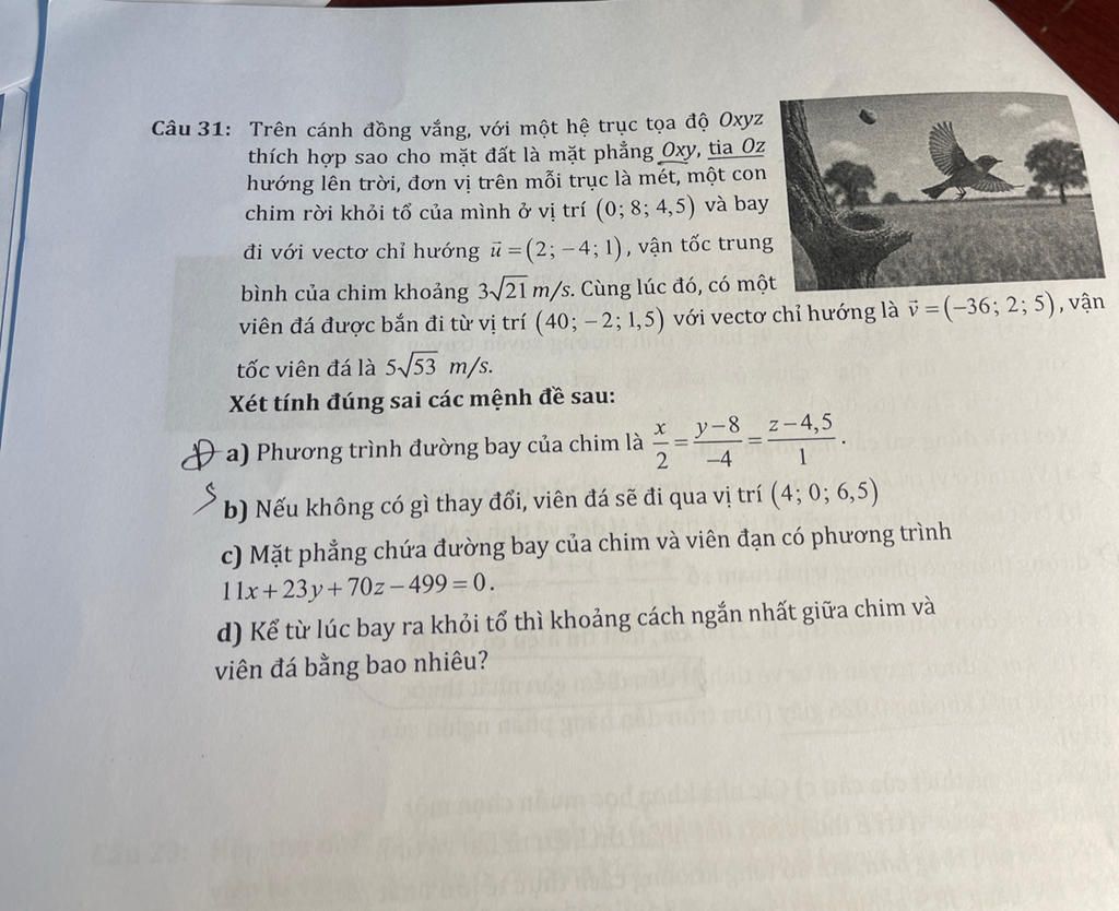 Mình thấy cách làm của bạn khá hay, ở ý b) nếu mà nhiều người không nghĩ ra cách hướng bay của viên đá mà sài cách phương trình đường thẳng thì về mặt đáp án là đúng nhưng mà sai bản chất nhỉ