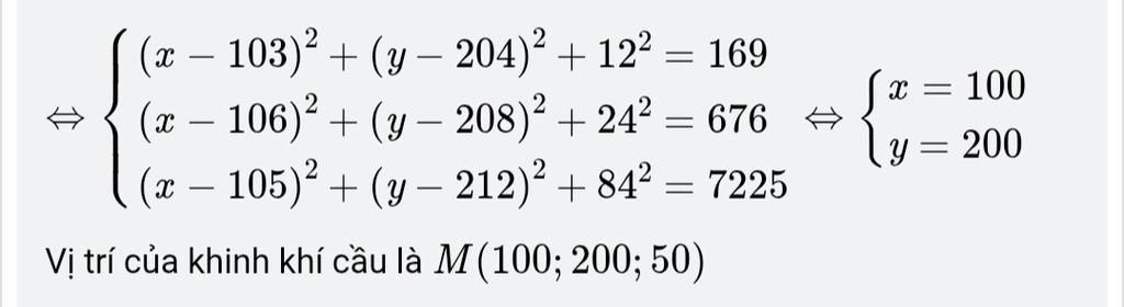 $\begin{cases}(x-103)^2+(y-204)^2+12^2=169\\ (x-106)^2+(y-208)^2+24^2=676\\ (x-105)^2+(y-212)^2+84^2=7225\end{cases}$