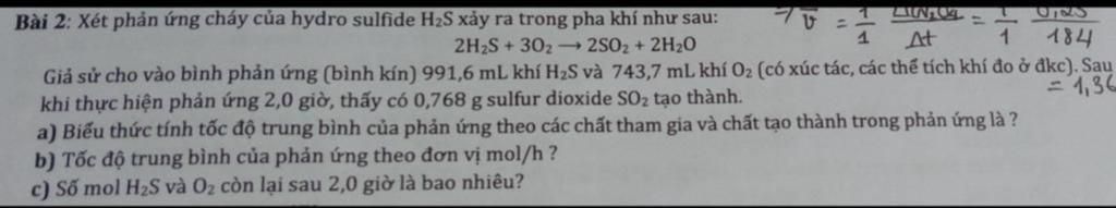 `a)` `\overline{v}=-1/{2}.{\Delta C_{H_2S}}/{\Delta t}=-1/{3}.{\Delta C_{O_2}}/{\Delta t}=1/{2}.{\Delta C_{SO_2}}/{\Delta t}=1/{2}.{\Delta C_{H_2O}}/{\Delta t}`