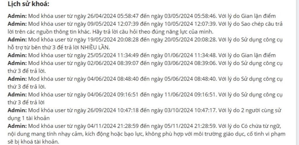 Admin: Mod khóa user từ ngày 26/04/2024 05:58:47 đến ngày 03/05/2024 05:58:46. Với lý do Gian lận điểm