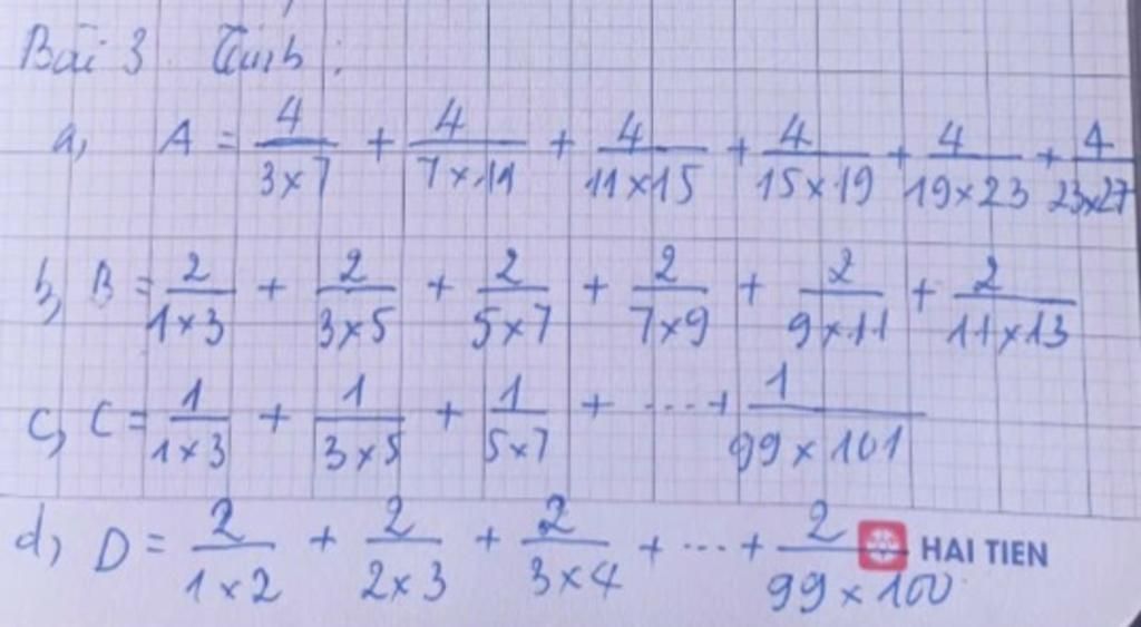 `a)A=4/(3xx7) +4/(7xx11) + 4/(11xx15) + 4/(15xx19) +4/(19xx23) + 4/(23xx27)`