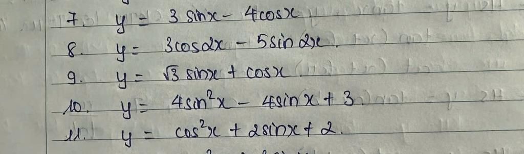 Vậy: `y_(min)=2` khi `sinx=1/2` và `y_(max)=11` khi `sinx=-1`