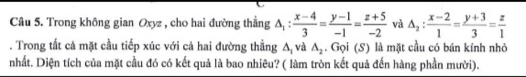 Gọi $A(4 + 3t; 1 - t; -5 - 2t), B(2 + t'; -3 + 3t'; t')$ lần lượt là $2$ điểm thuộc $\Delta_1$ và $\Delta_2$ sao cho $AB$ là đoạn vuông góc chung, $I$ là tâm mặt cầu $(S)$.