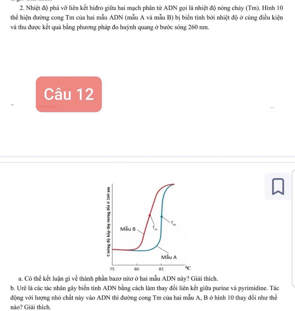 2. Nhiệt độ phá vỡ liên kết hiđro giữa hai mạch phân tử ADN gọi là nhiệt độ nóng chảy (Tm). Hình 10