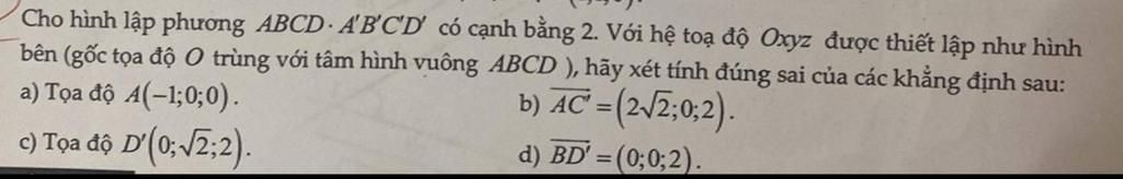 Cho hình lập phương ABCD ABCD có cạnh bằng 2. Với hệ toạ độ Oxyz được thiết lập như hình