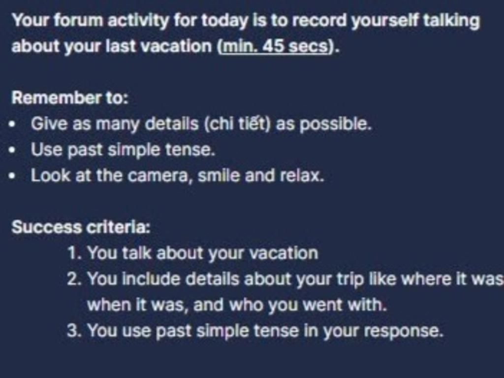 `-` Kỳ nghỉ năm trước để lại cho tôi ấn tượng lớn nhất trong cuộc đời. Mặc dù vậy, tôi đã đến nhiều nơi đặc biệt với tôi và đã học được nhiều bài học. Chuyến đi rất thành công và thú vị. Chuyến đi đưa tôi đến Đà Nẵng, vào khoảng giữa tháng 6 năm ngoái, và những người đi cùng tôi là gia đình tôi. Tôi đã chụp ảnh và ăn đồ ăn ở đây, và cũng mua quà lưu niệm khi tôi sắp về nhà. Đó là lần cuối cùng tôi đi du lịch.