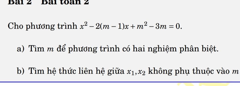 `=> {(x_1 + x_2 = -b/a = 2m - 3 + 1),(x_1x_2 = c/a = m^2 - 3m):}`