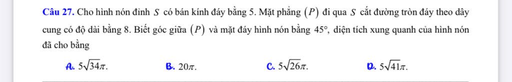 Mặt phẳng $(P)$ đi qua $S$ cắt đường tròn đáy theo dây cung $AB = 8$