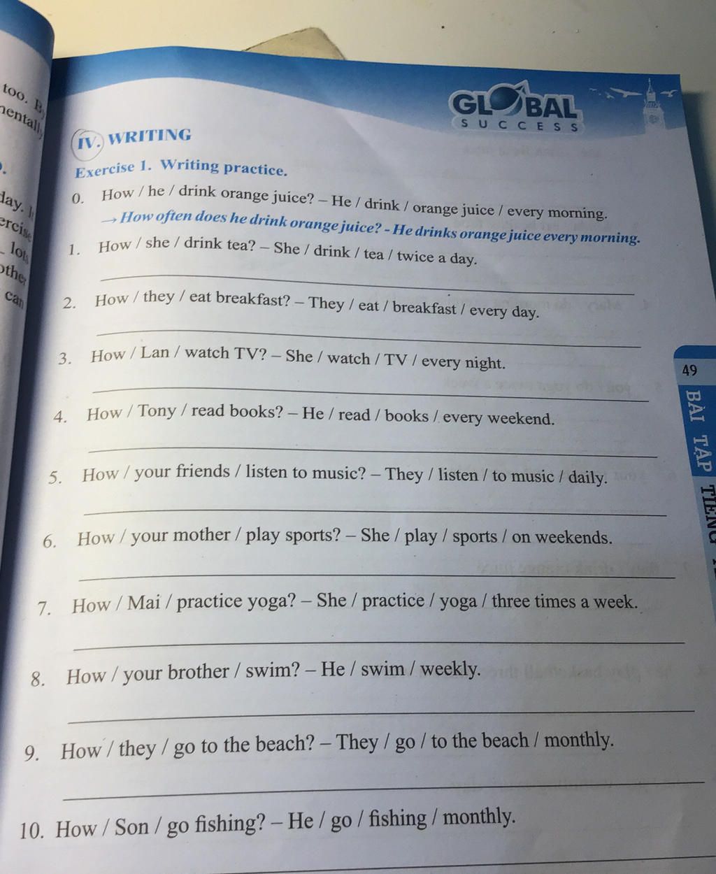 `6.` How often does your mother play sports? She plays sports on weekends.