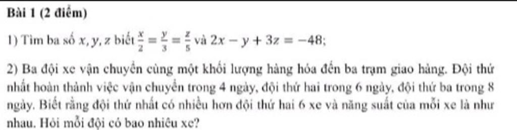 `1)` Ta có: `x/2 = y/3 = z/5` và `2x - y + 3z = -48`