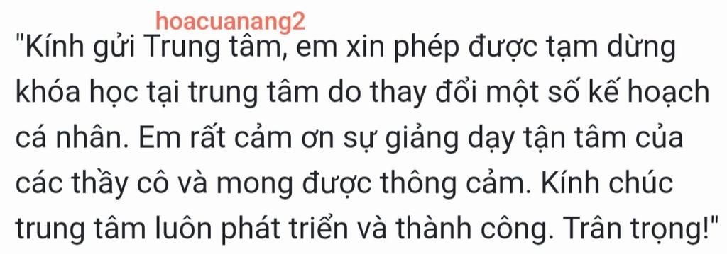 Dạ em chào trung tâm, sau khi cân nhắc lại lịch học và một vài lý do cá nhân, em xin phép được dừng tham gia khóa học này. Em rất cảm ơn trung tâm đã hỗ trợ thời gian qua