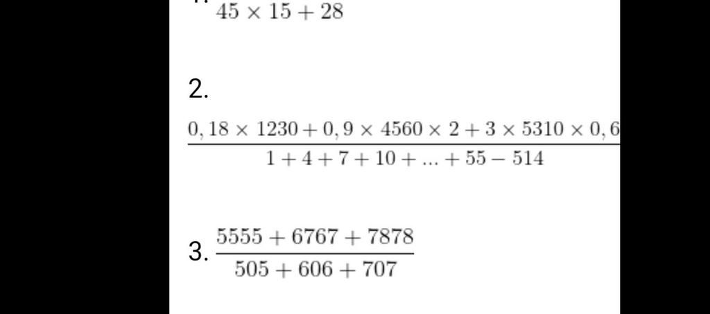 `2) (0,18 xx 1230 + 0,9 xx 4560 xx 2 + 3 xx 5310 xx 0,6)/(1 + 4 + 7 + 10 + ... + 55 - 514)`