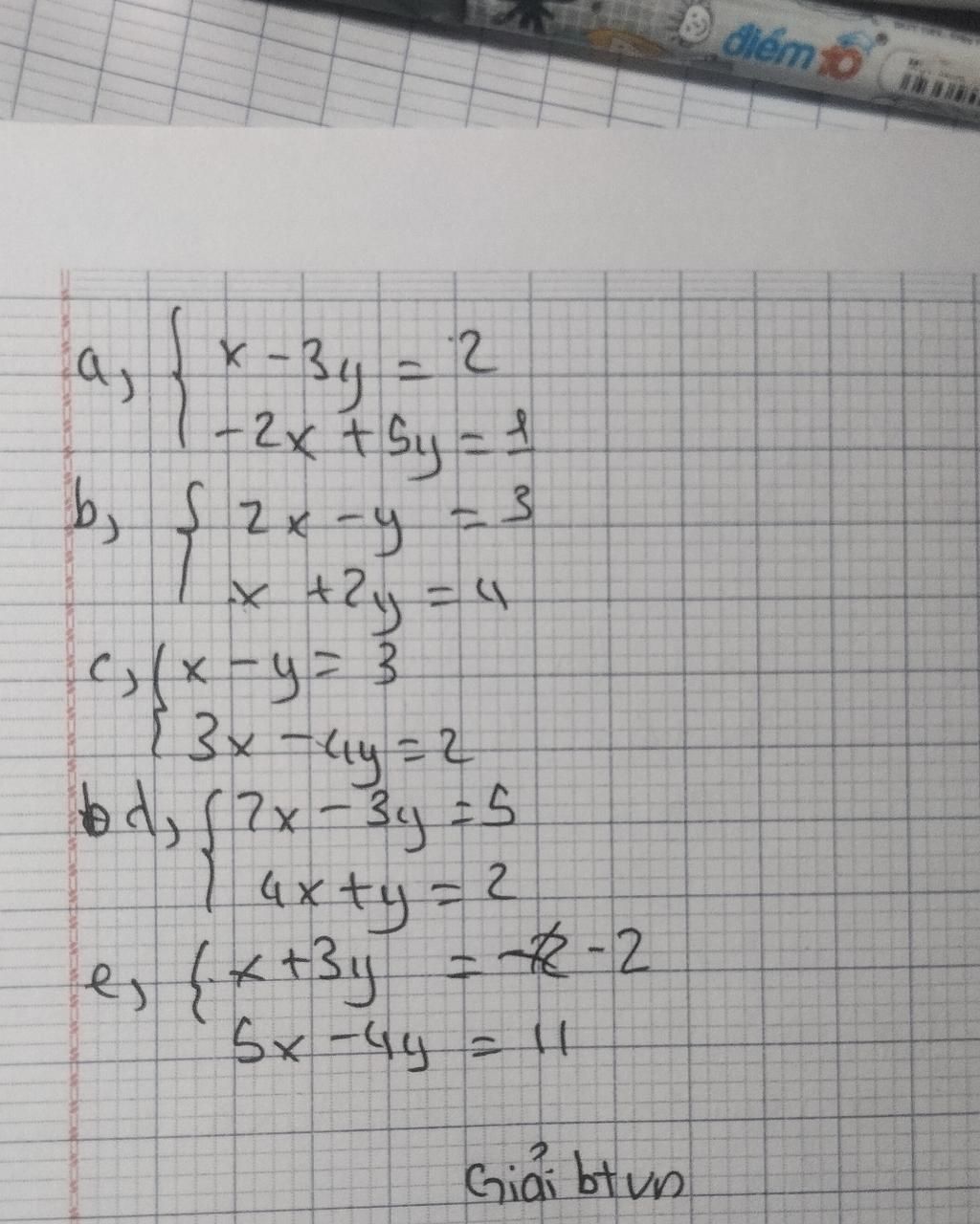 $\begin{cases} x-3y=2\\-2x+5y=1 \end{cases}$