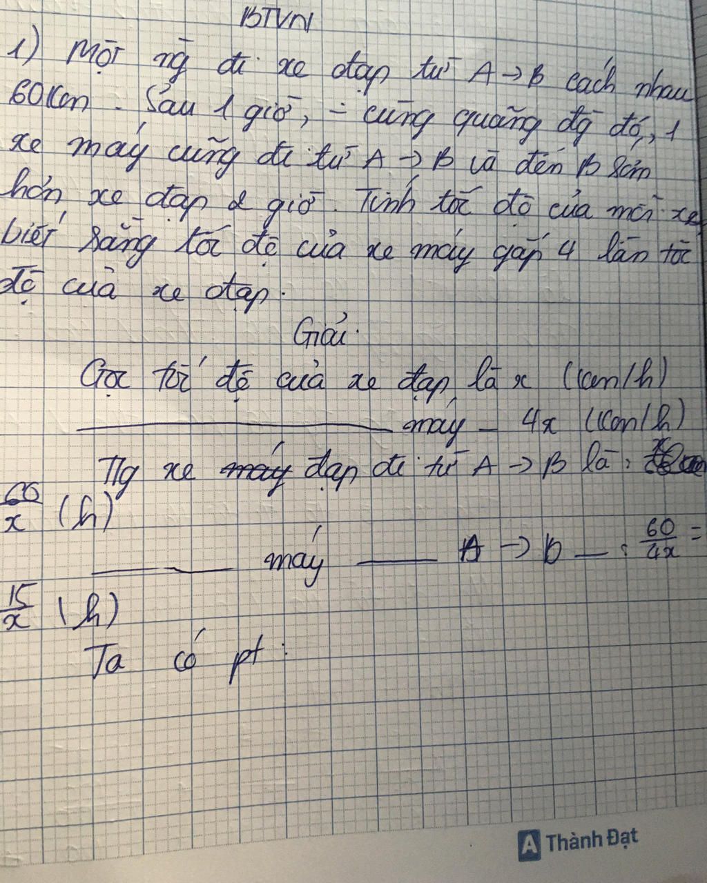 Thời gian xe đạp đi từ `A` đến `B` là: `60/x` (giờ)