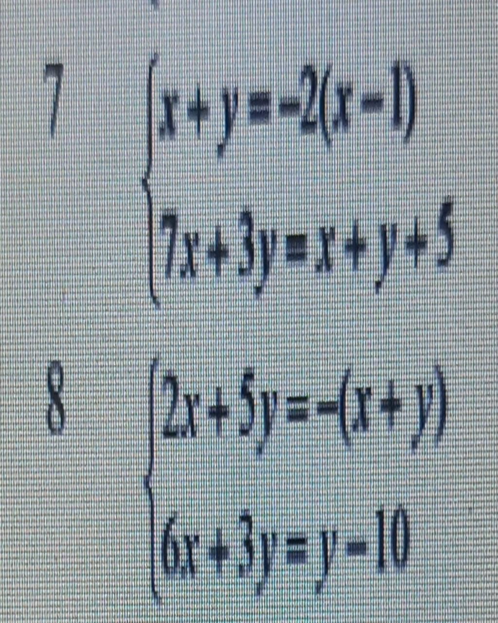 `7) {(x + y = -2(x - 1)),(7x + 3y = x + y + 5):}`