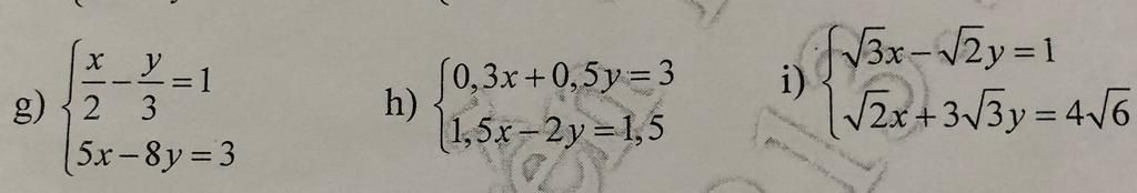 `h,` $\begin{cases} 0,3x + 0,5y = 3\\1,5x - 2y = 1,5\end{cases}$