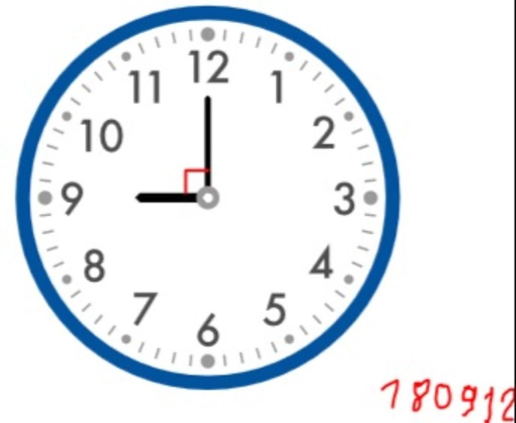 `-` Từ hình ảnh, ta thấy kim giờ và kim phút vuông góc với nhau và có số đo là `90^o`