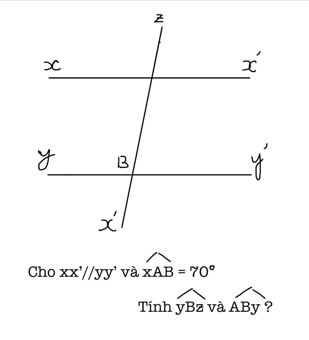 Vì `xx'//yy'` nên $\widehat{xAB}=$$\widehat{ABy'}=70^o$