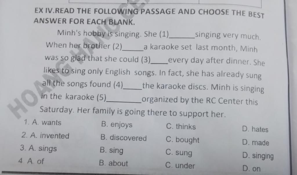 Câu 1: Minh's hobby is singing. She (1) _______ singing very much.