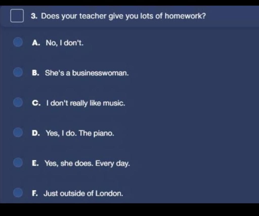$\Rightarrow$ Câu hỏi "Does your teacher..." thì hiện tại đơn, chủ ngữ là she $\rightarrow$ câu trả lời đúng là "Yes, she does."