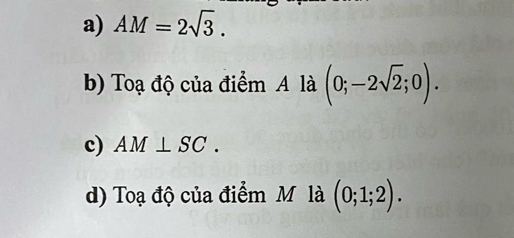 Đề bài : Câu 1. Trong không gian Oxyz, cho hình chóp đều S.ABCD CÓ đáy ABCD là hình vuông tâm O, cạnh bằng 2 căn 2; SO = 4 ; M là trung điểm của SC. Thiết lập hệ tọa độ. Xét tính đúng, sai của các khẳng định sau :